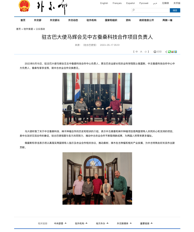 2023年5月15日,驻古巴大使马辉会见古中蚕桑科技合作中心负责人、原古巴农业部长和农业科学院院士佩雷斯,中古蚕桑科技合作中心中方负责人、蚕桑专家李龙等,就中古农业合作交换意见。